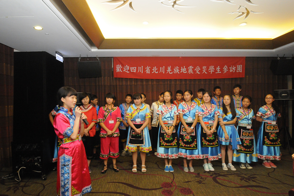 在欢迎晚宴上,北川羌族学生们以歌曲《我们都是一家人》、羌族敬酒歌以及羌族特色歌舞表演向高金素梅女士、爱心企业家以及广大的台湾同胞的爱心善举表达了谢意。(四川省台办供稿)