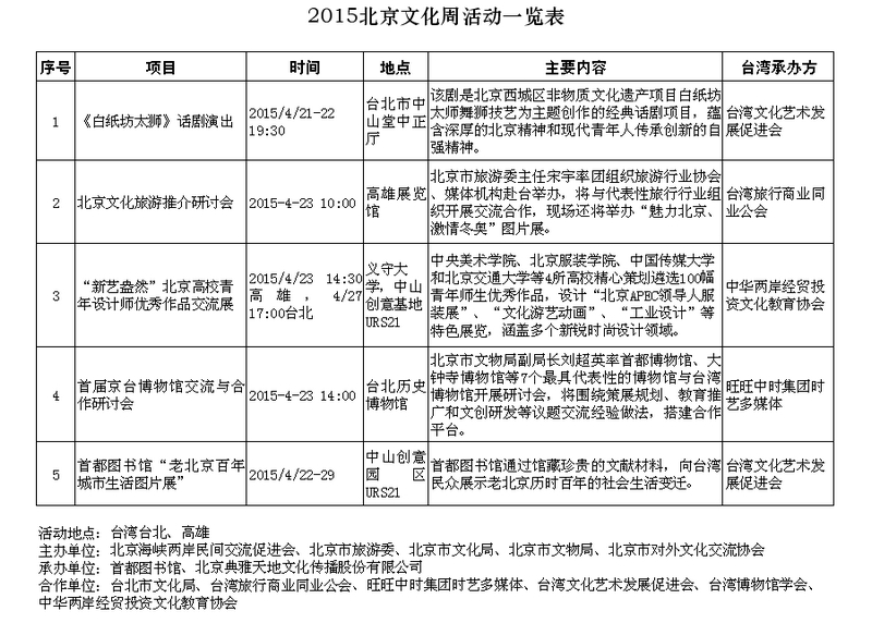 由北京海峡两岸民间交流促进会、北京市文化局、北京市旅游局、北京市文物局、北京市对外文化交流协会和台湾相关文化单位共同主办,“同仁堂”集团提供支持的“2015北京文化周”活动将于4月21日至29日在台北、高雄等地精彩呈现。