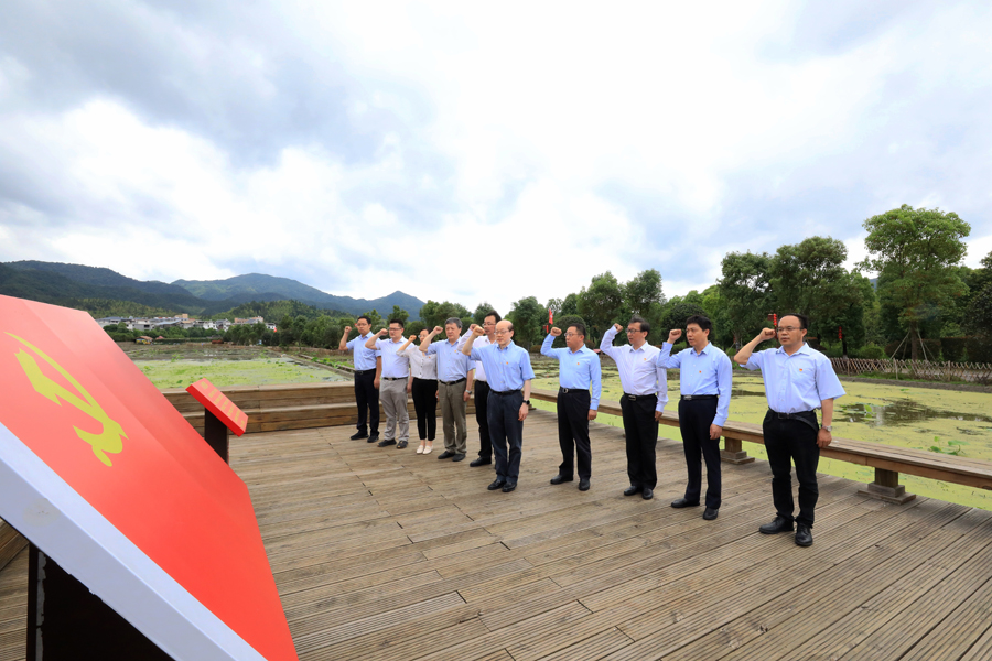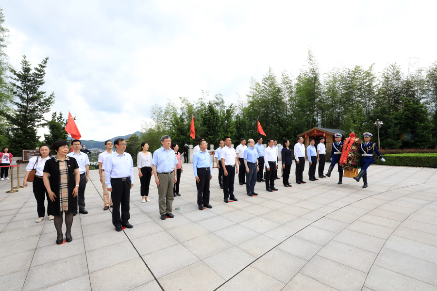 五月的龙岩,万物欣荣,红色的土地上孕育着无限生机与希望。刘结一一行先后来到毛主席纪念园、古田会议会址瞻仰学习。在雄壮的《东方红》背景音乐中,调研组全体党员向毛主席雕像三鞠躬并敬献鲜花,绕雕像一周,诵读毛主席诗词,感悟中国共产党人的初心使命。在党旗前,刘结一带领调研组全体党员重温入党誓词,铭记对党庄严承诺,不断进取,奋斗终身。