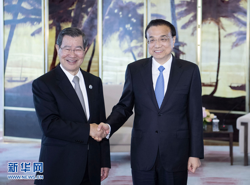 3月27日,国务院总理李克强在海南博鳌会见台湾两岸共同市场基金会荣誉董事长萧万长一行。 新华社记者 李涛 摄