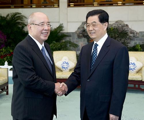 5月10日,中共中央总书记胡锦涛在北京钓鱼台国宾馆会见中国国民党荣誉主席吴伯雄一行。新华社记者 黄敬文 摄