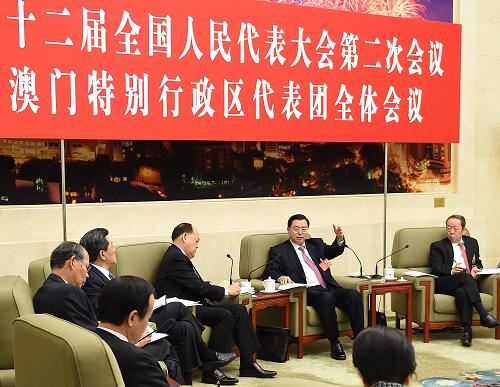 3月6日,中共中央政治局常委、全国人大常委会委员长张德江参加十二届全国人大二次会议澳门代表团的审议。新华社记者 刘建生 摄