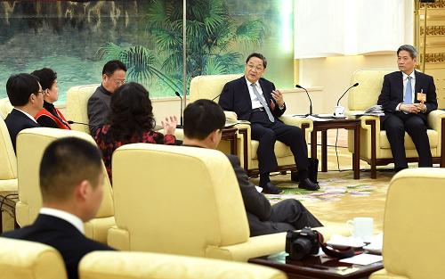 3月6日,中共中央政治局常委、全国政协主席俞正声看望出席全国政协十二届二次会议的致公党、无党派人士、侨联界委员并参加讨论。新华社记者 黄敬文 摄