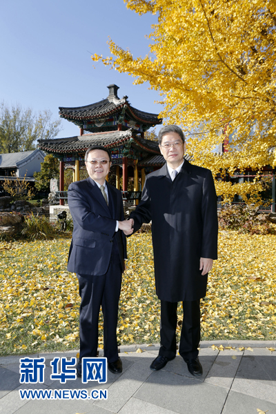 11月12日,国务院台湾事务办公室主任张志军(右)在北京与台湾方面陆委会主委王郁琦会面。 新华社记者沈伯韩摄