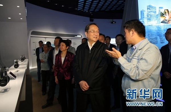 4月23日至25日,中共中央政治局常委、全国政协主席俞正声在江苏南京调研。这是4月25日,俞正声来到南京中电熊猫平板显示科技有限公司,了解企业生产经营、产品研发、技术创新等情况。新华社记者刘卫兵摄