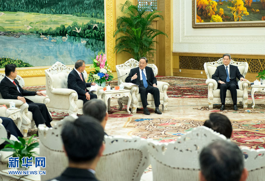9月18日,中共中央政治局常委、全国政协主席俞正声在北京人民大会堂会见台湾县市长参访团。 新华社记者 王晔 摄