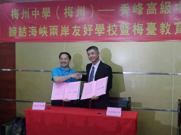 据悉,秀峰高级中学位于台湾新北市,已有60年历史,是一所完全中学。在台湾中华教育文化经贸促进协会的牵线沟通下,秀峰高级中学与我市梅州中学缔结成为海峡两岸友好学校。会上,梅州中学校长丘广辉与秀峰高级中学校长陈栋远签订缔结协议,约定通过多种渠道加强两校师生的交流合作,推动梅台两地教育交流合作进一步深化。