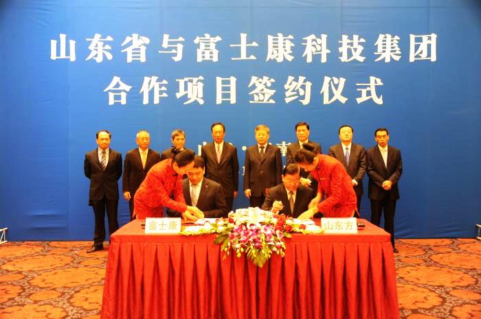 10月25日下午,山东省与富士康科技集团举行合作项目签约仪式在济南举行。山东省委副书记、山东省省长郭树清,山东省副省长夏耕,台湾富士康科技集团总裁郭台铭等出席仪式;山东省政府秘书长蒿峰主持仪式,临沂市市长陈先运、菏泽市市长孙爱军分别与富士康科技集团代表就合作项目签约。