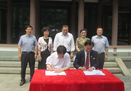 5月26日上午,在浙江省、杭州市台办的协调下,杭州市图书馆馆长储树青与两岸文教经贸交流协会会长冯沪祥在花圃小隐圆签订了“国学讲坛九十九讲”合作框架。