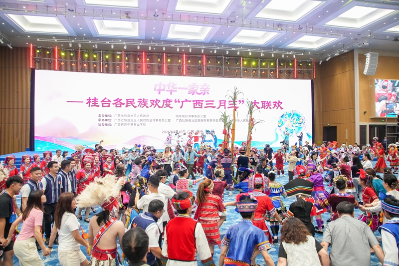 4月16日,2026年中华一家亲——桂台各民族欢度“广西三月三”大联欢活动在广西南宁举行。本次活动由广西壮族自治区人民政府和国务院台湾事务办公室共同主办。500余名桂台同胞跨越山海,齐聚一堂,共叙两岸亲情,共话交流合作。海峡两岸关系协会副会长仇开明、广西壮族自治区副主席蓝晓,台北广西同乡会理事长彭桂港、台湾花莲县陶朴阁美学才艺发展协会理事长连美惠出席活动并致辞。