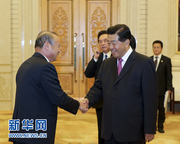 8月30日,中共中央政治局常委、全国政协主席贾庆林在北京人民大会堂会见世界台湾商会联合总会参访团全体成员。这是贾庆林与世界台湾商会联合总会参访团团长黄正胜握手。新华社记者 丁林 摄