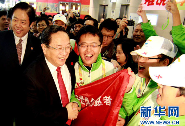 2010年10月31日,俞正声来到上海世博园内的6号门区域看望世博会工作人员,感谢他们的辛勤劳动。新华社记者 张明 摄