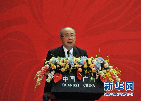 10月27日,中国国民党荣誉主席吴伯雄在论坛闭幕式上致辞。当日,第九届两岸经贸文化论坛在广西南宁举行闭幕式。与会两岸各界人士经过两天研讨,提出了多项共同建议。 新华社记者 周华 摄