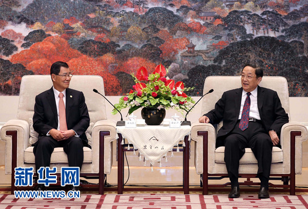 11月4日,中共中央政治局常委、全国政协主席俞正声在南京出席2013两岸企业家紫金山峰会开幕式并致辞。这是开幕式前,俞正声会见台湾方面两岸企业家峰会理事长萧万长。新华社记者 庞兴雷 摄