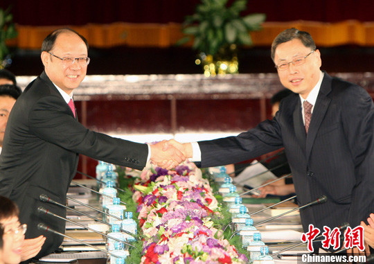 6月8日,海协会副会长郑立中(左)一行飞抵台湾,当日下午与海基会副董事长