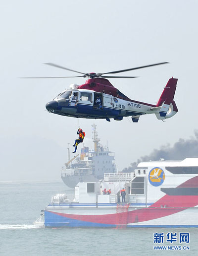 这是来自大陆的专业救助直升机放下专业救援人员进行海上救援(9月16日摄)。当日,“2010年海峡两岸海上联合搜救演练”在台湾海峡厦门、金门附近海域举行,两岸10余艘船只和3架直升机参与。此次联合演练主题为“保障两岸三通共建平安海峡”,是两岸搜救力量首次共同策划、组织、参与、合作和完成大规模的海上联合演练。 新华社记者魏培全摄