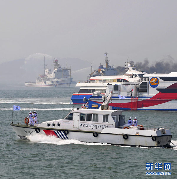 这是海峡两岸首次共同开展海陆空立体搜救演练现场(9月16日摄)。当日,“2010年海峡两岸海上联合搜救演练”在台湾海峡厦门、金门附近海域举行,两岸10余艘船只和3架直升机参与。此次联合演练主题为“保障两岸三通共建平安海峡”,是两岸搜救力量首次共同策划、组织、参与、合作和完成大规模的海上联合演练。 新华社记者魏培全摄