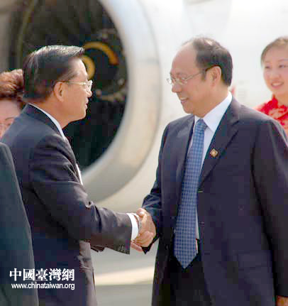 大陆海协会常务副会长郑立中前往机场迎接,并与江丙坤亲切握手。(记者 张弛 摄)