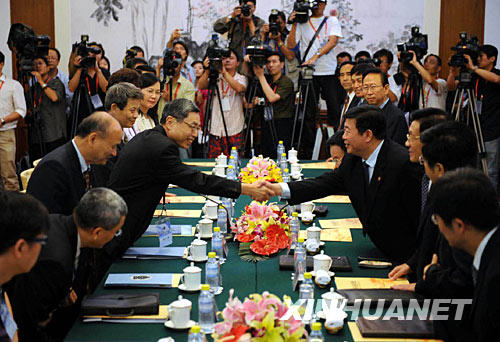 6月12日下午,海峡两岸关系协会与海峡交流基金会在北京钓鱼台国宾馆就大陆居民赴台旅游议题进行协商。这是海协会副会长孙亚夫(右)和海基会副董事长高孔廉握手。 新华社记者李晓果摄