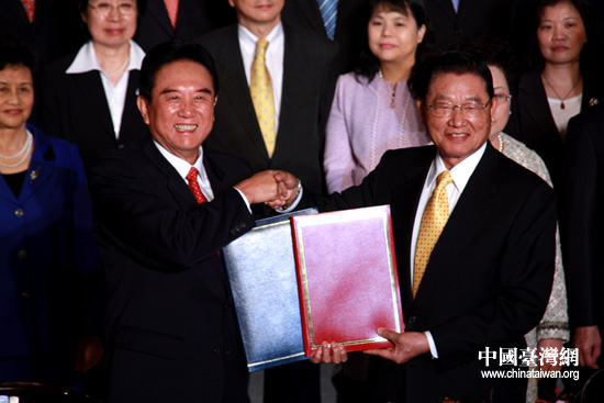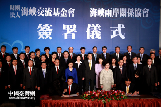 中国台湾网12月22日台中消息 22日下午,海协会会长陈云林与台湾海基会董事长江丙坤在台中市签署《海峡两岸渔船船员劳务合作协议》、《海峡两岸农产品检验检疫合作协议》、《海峡两岸标准计量检验认证合作协议》等三项协议。(中国台湾网 李徽 摄)