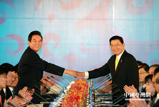 12月21日上午9时,两岸两会领导人第六次会谈在台北圆山饭店举行,海协会会长陈云林与海基会董事长江丙坤在台北再度握手。(中国台湾网 钟宝华 摄)