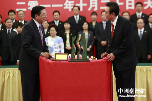 海协会会长陈云林向海基会董事长江丙坤赠送礼物“连年有余”。(中国台湾网 陈佳慧 摄)