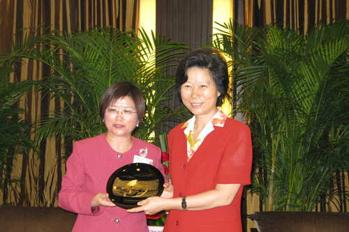全国妇联副主席、书记处书记陈秀榕(右一)向参访团(左一为高雄县工商妇女企业管理协会理事长蔡淑雅)赠送纪念品。